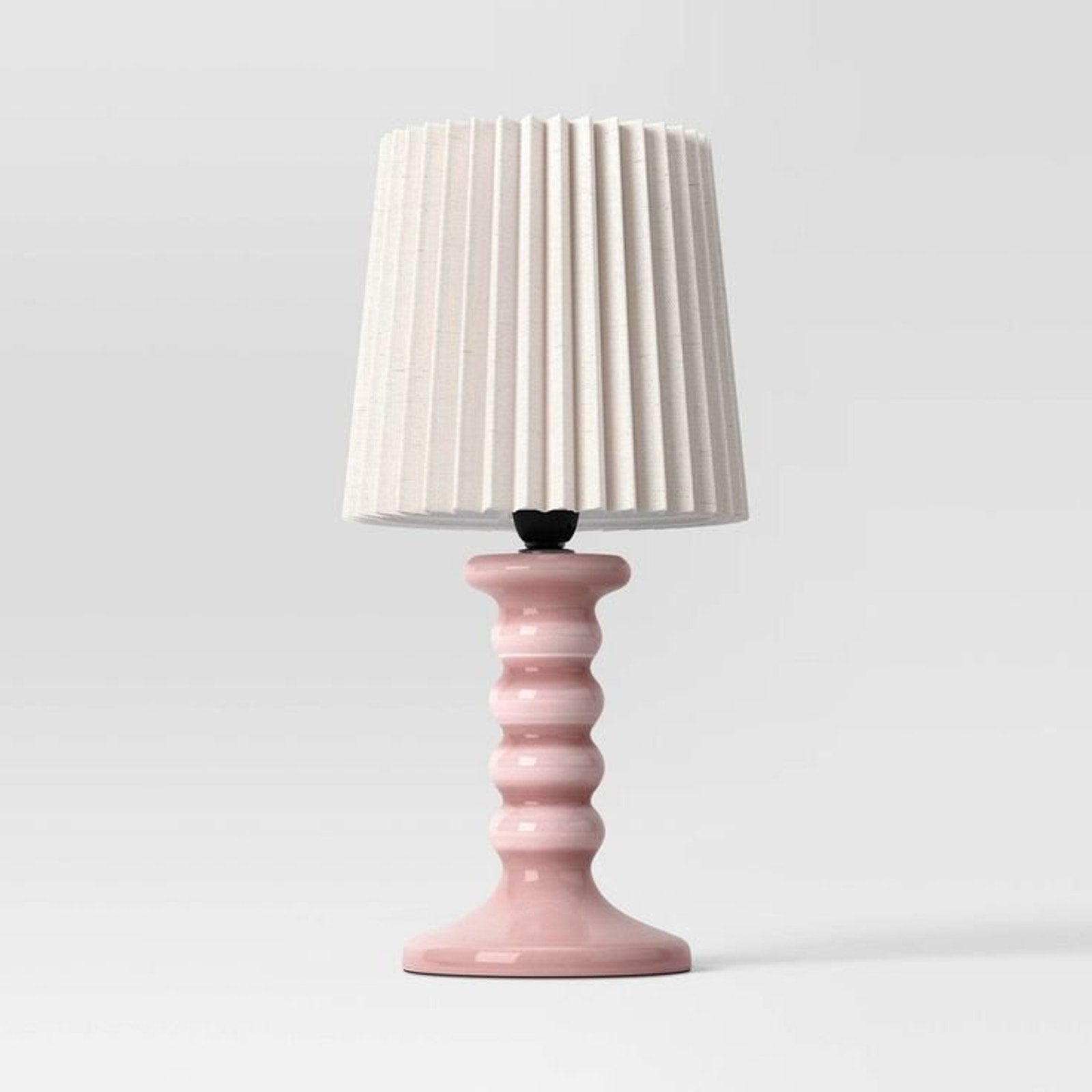 Brighten up your space with this stylish pair of Target table lamps. Each lamp features a glossy pink sculpted stick base paired with a pleated beige shade for a chic, modern touch that works in bedrooms, living rooms, or offices. These are sold as a set of two, brand new in the box.
