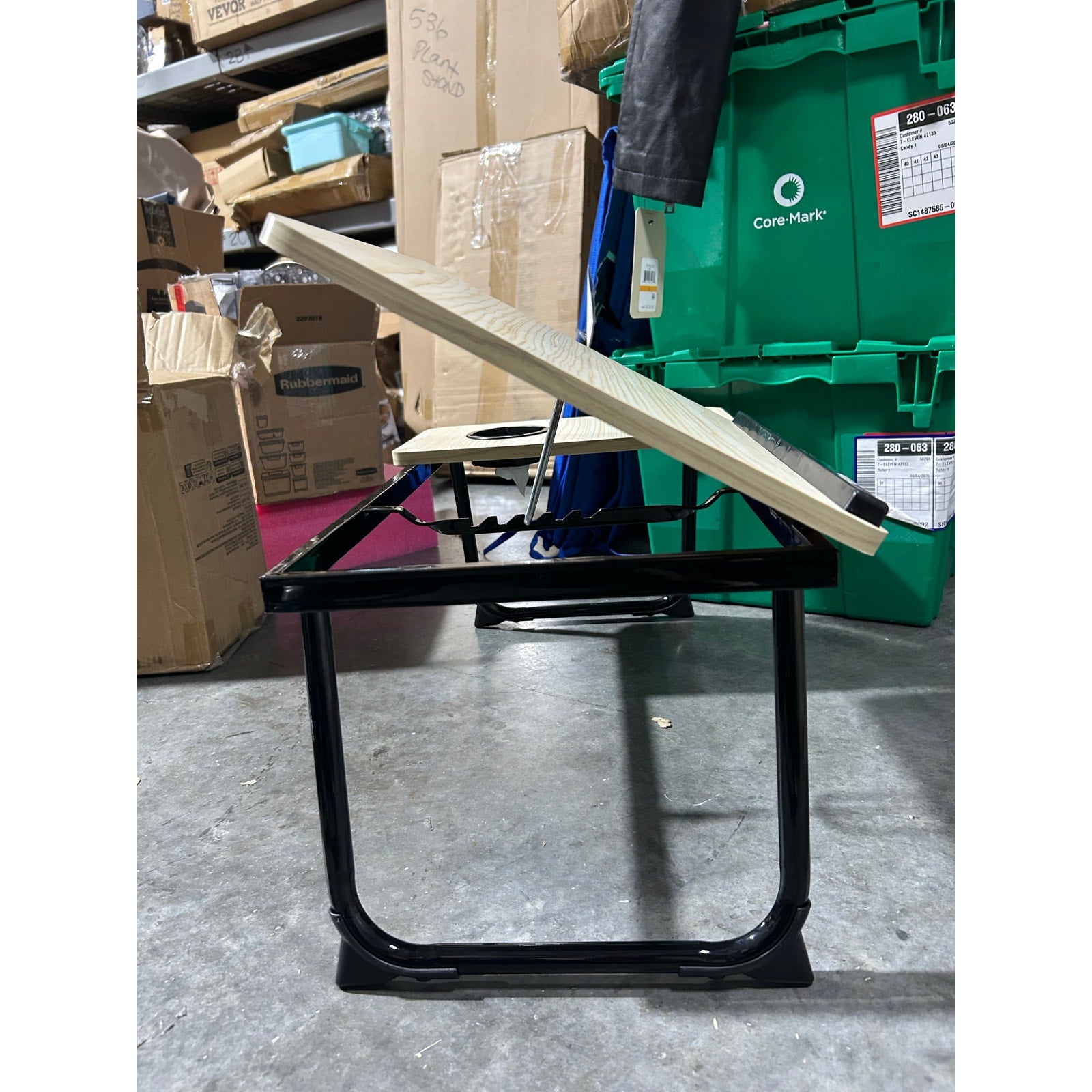 Good quality wood lap desk with folding legs. Laptop side tilts (15”) with stopper bar, plus built-in cup holder. Easy to store, sturdy, and perfect for bed, couch, or on the go.
