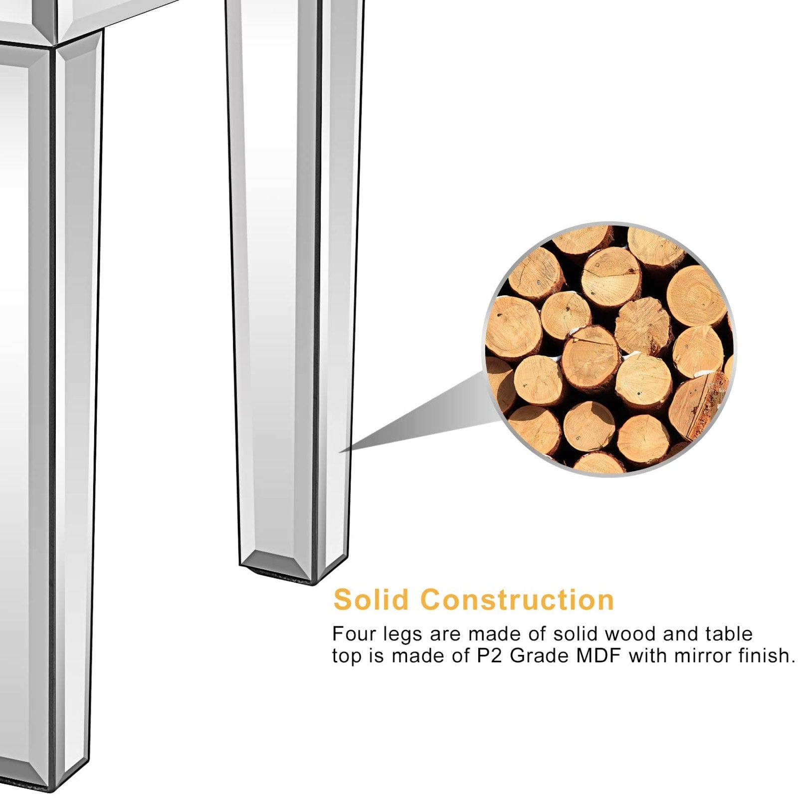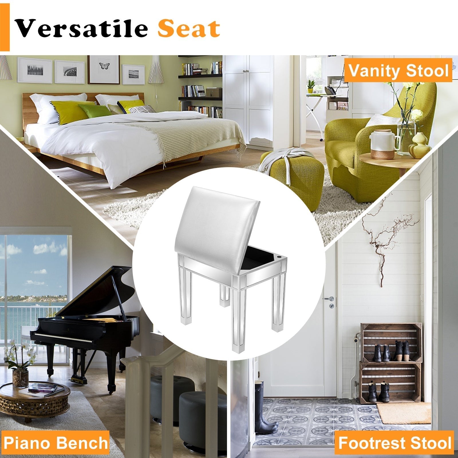 Add a touch of glam to your space with this VINGLI mirrored vanity stool, featuring a reflective silver finish that instantly brightens any room. Its plush 2-inch faux leather cushion offers comfortable seating, while the solid wood frame provides sturdy support with a 300-lb weight capacity. Lift the seat to reveal a hidden storage compartment—perfect for keeping makeup, brushes, or small essentials neatly tucked away. Measuring 17" wide, 13" deep, and 18" high, this versatile rectangular bench works beautifully as a vanity chair, shoe bench, or even a piano stool. It features non-scratch rubber pads to protect floors and requires minimal assembly with just the legs to attach. This item is new in box.