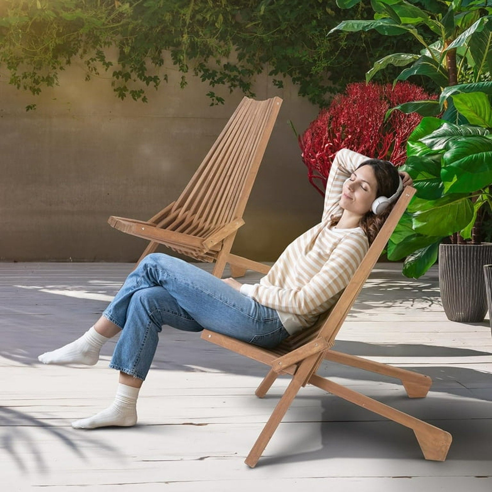Foldable acacia wood Adirondack-style chair with a breathable slatted seat and tall ergonomic back for relaxed indoor or outdoor lounging. Features a one-step folding design for easy storage and transport, upgraded legs for stability, and a natural wood finish that works perfectly on patios, decks, balconies, or inside cozy spaces.