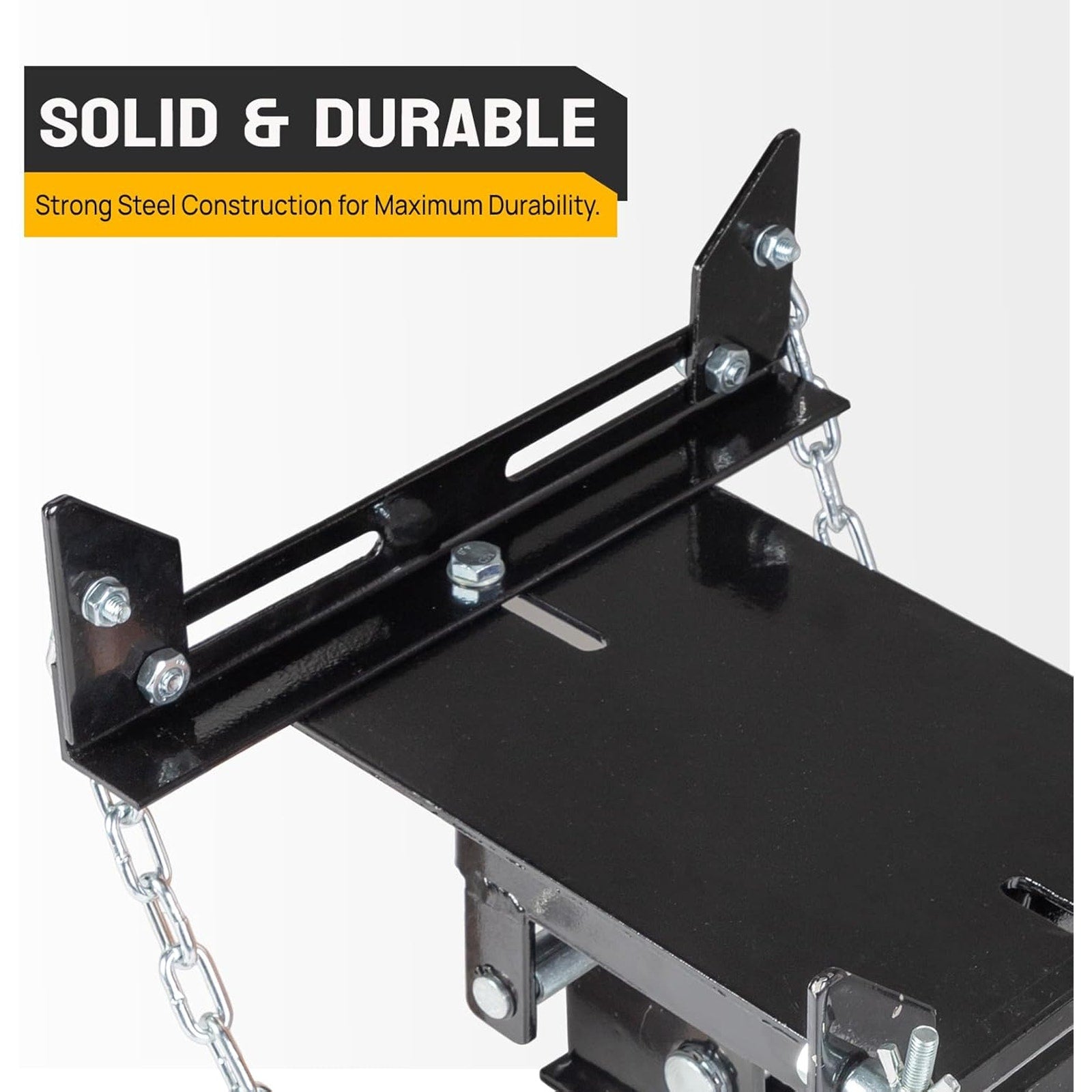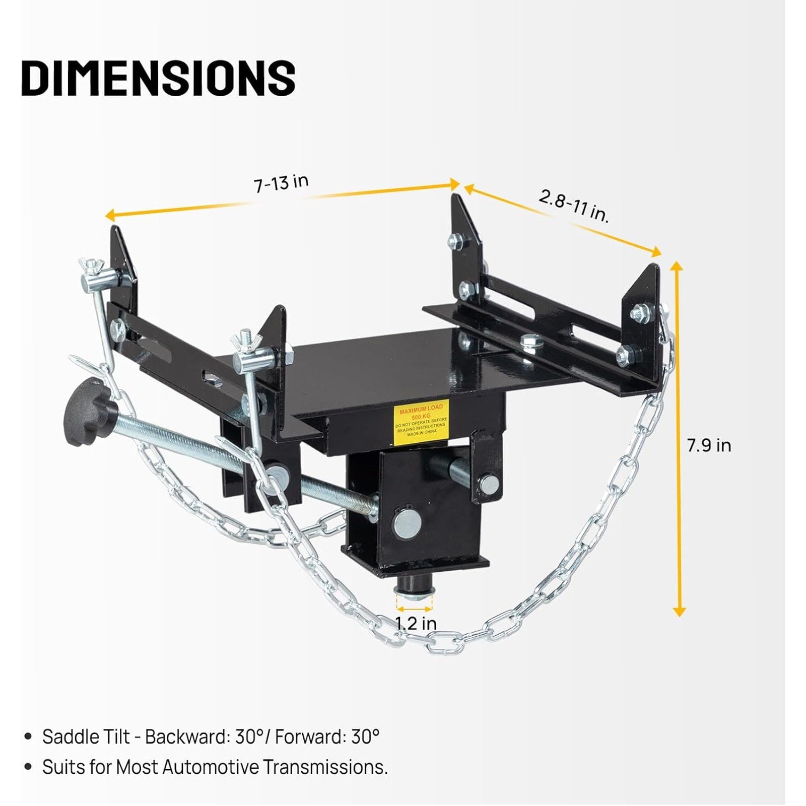 This heavy-duty steel adapter converts a standard floor jack into a high-capacity transmission jack, giving you steady 1100-lb support for cars and light trucks. The adjustable saddle expands and tilts 30° forward and backward for precise positioning, while included safety chains keep everything secure. A solid, reliable setup for smooth gearbox removal and installation.