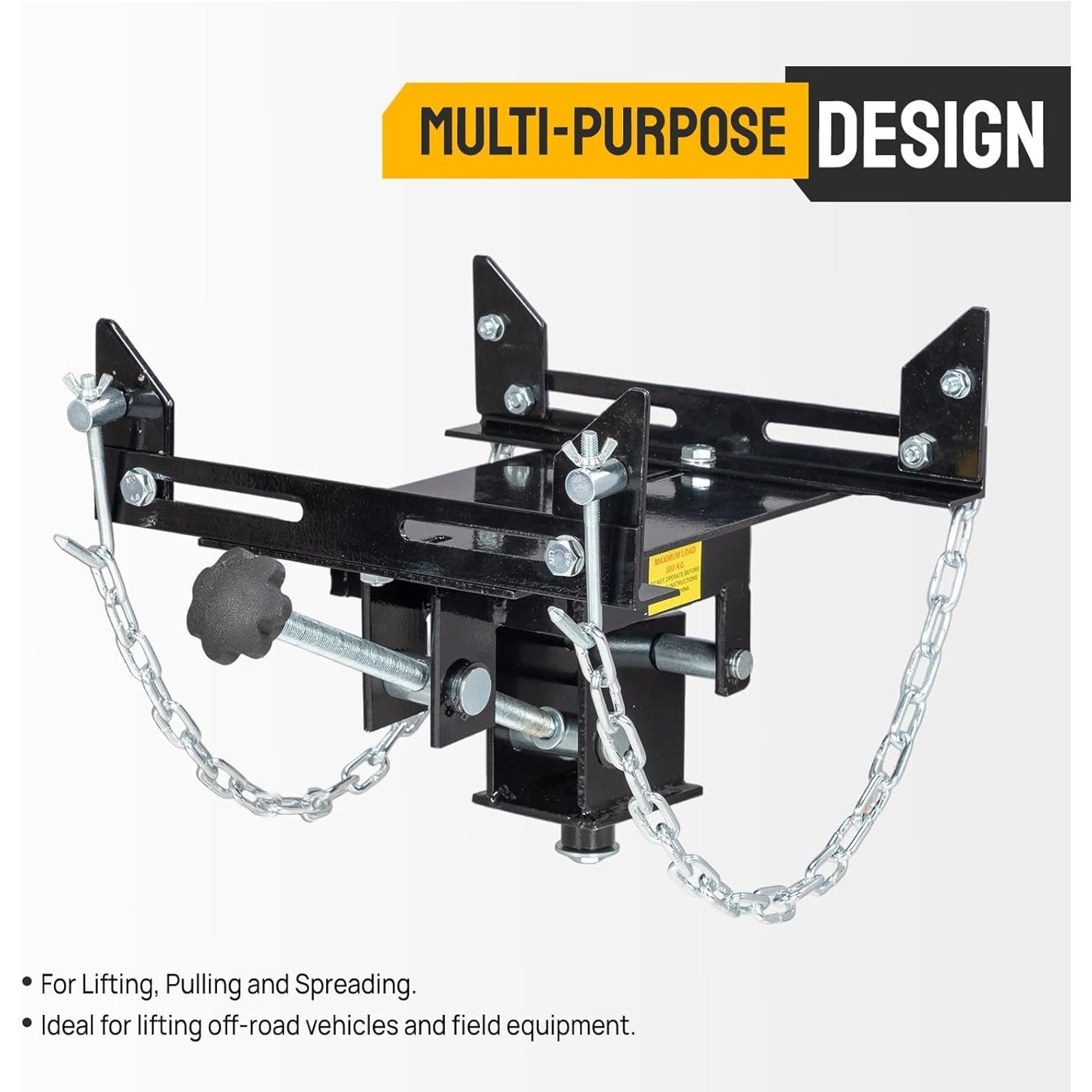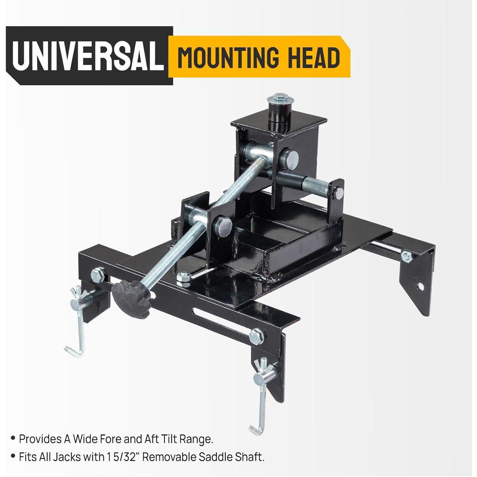 / Color Red / Material Heavy-Gauge Alloy Steel / Capacity 1100 lbs / Spigot Diameter 1.2" / Saddle Width 2.8"–11" / Saddle Length 7"–13" / Tilt 30° Forward & Backward / Includes Two 23.6" Safety Chains / Product Weight 17.6 lbs
