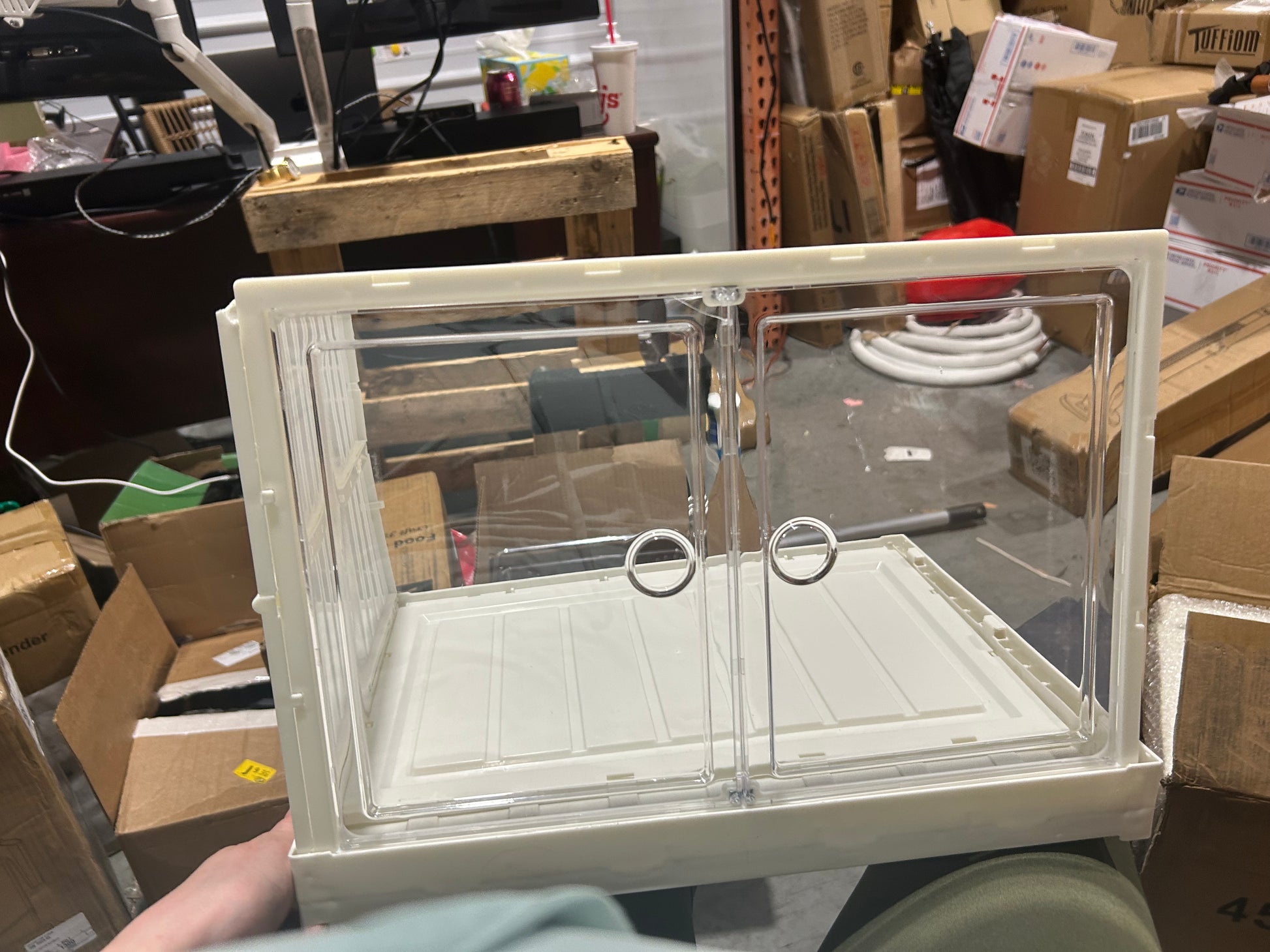 Say goodbye to clutter with this set of five heavy-duty, collapsible storage boxes designed for easy organization and a clean look. Made from durable PP plastic, each box features magnetic double doors with a transparent front panel for quick visibility, along with dustproof and waterproof protection to keep contents safe. The stackable, foldable design snaps together with tool-free assembly, making setup fast and flexible for closets, bedrooms, playrooms, or storage spaces. Please note that stock photos are for reference only and may vary slightly from the actual product; door styles differ minimally—see photos of the actual boxes included. This set includes five boxes, each measuring approximately 17.5 x 14 x 12 inches. No wheels are included.