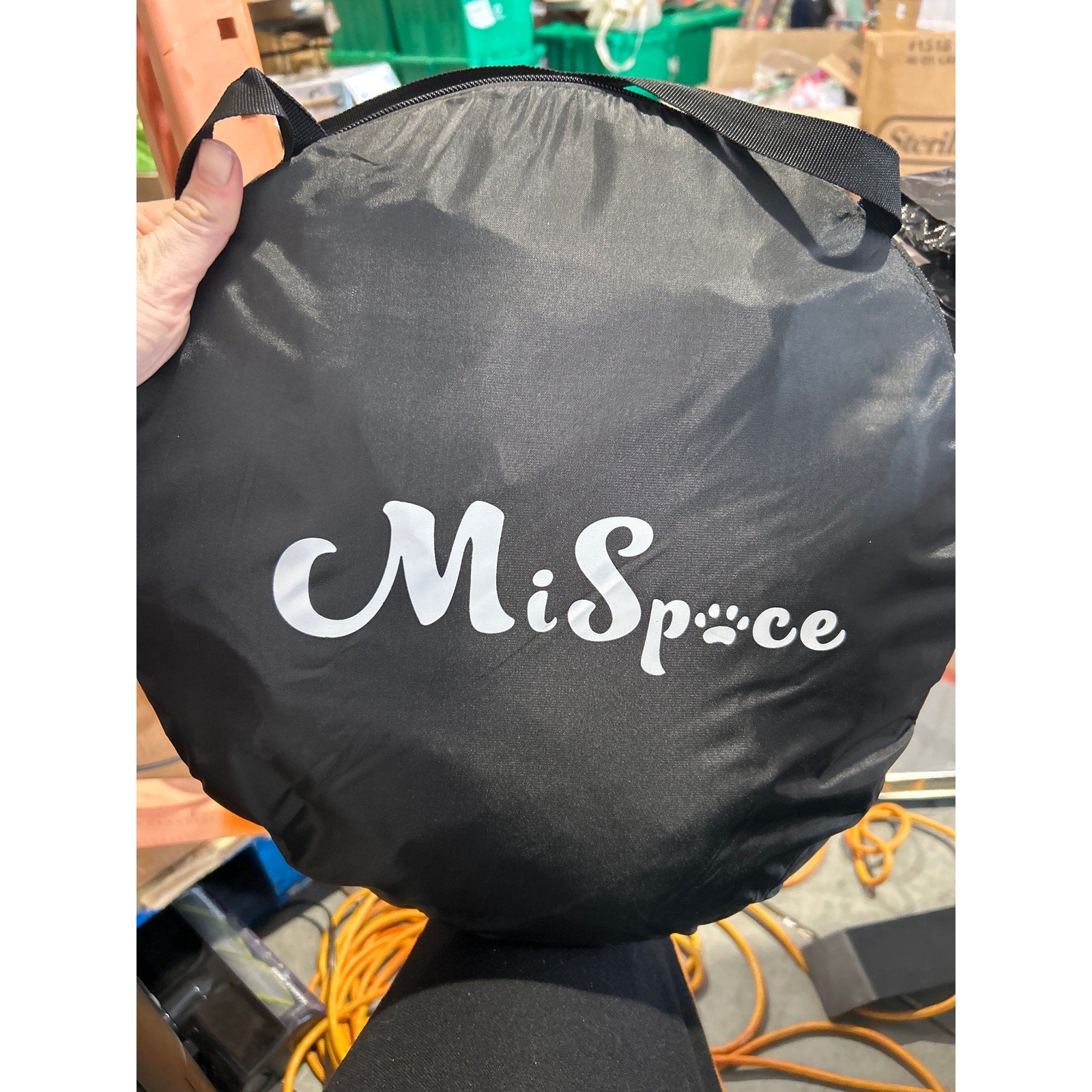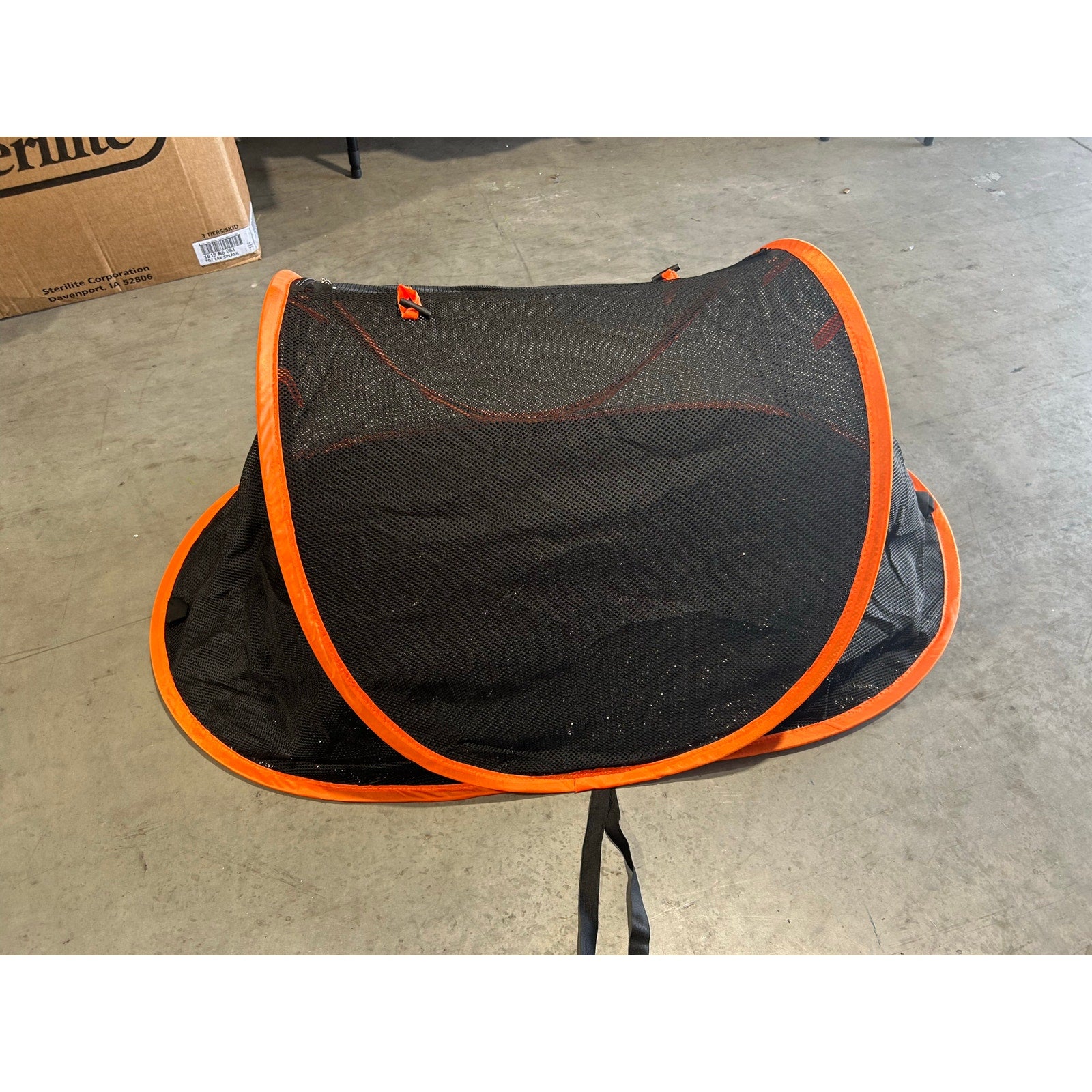 Lightweight pop-up pet tent for indoor/outdoor use. Black mesh walls with orange trim keep pets safe and ventilated. Features zippered doors, two stakes for outdoor setup, and folds flat into the MiSpace paw-print carrying bag for easy travel.