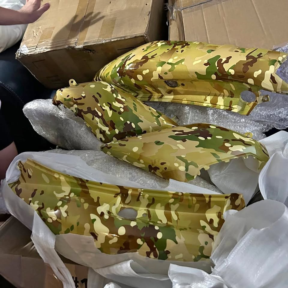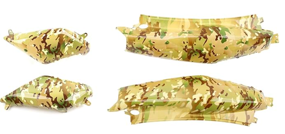 Upgrade your ride with this bold yellow camouflage fairing kit from Mokuo. Made from durable ABS material and designed to fit Yamaha Zuma models from 2022 and 2023. Includes: Front Side Cover + Rear Side Cover. Brand new, never used. 4 complete sets available, 3 are still wrapped in plastic.